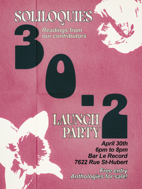 Soliloquies Anthology is launching issue 30.2, our last issue of the year on Thursday, April 30th.